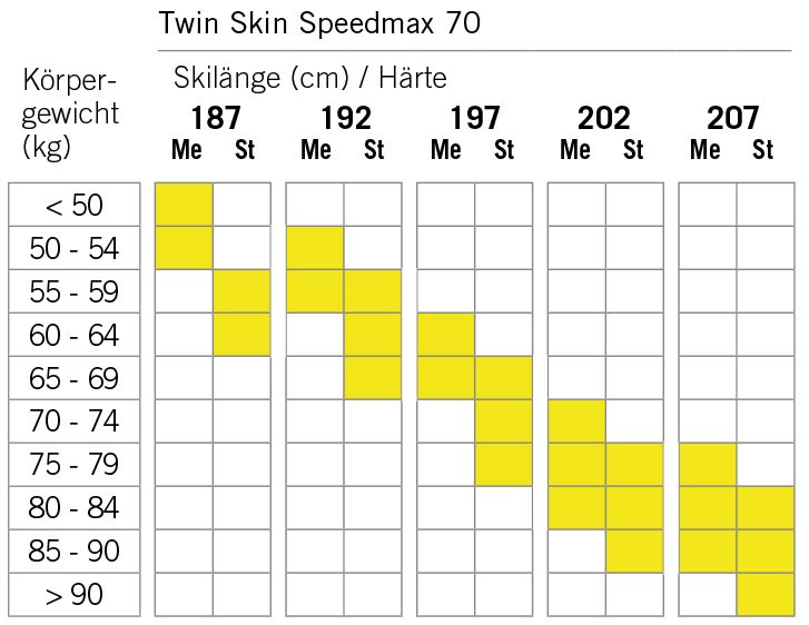 Der neue Twin Skin Speedmax 70 ist ein leichter, hochwertiger Fellski dank Air Core Basalite Pro Kern, der nicht nur optisch ins Auge sticht. Die beiden kürzeren, dafür breiteren Mohair-Fellstreifen sorgen, auch bei eisigen Bedingungen, für perfekten Grip und hervorragende Gleiteigenschaften. Zum Schutz des Belages werden die Ski mit einer dünnen Wachsschicht ausgeliefert, die vor dem ersten Einsatz abgezogen und ausgebürstet werden muss.