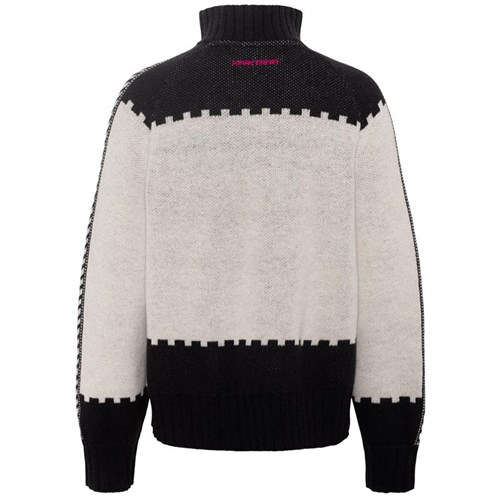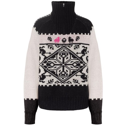 Lockere Passform, Hoher Kragen, Voluminöse Ärmel, Wärmend, Jacquard-Strick, Maschenweite 7, Gestricktes Logo, halblanger Reißverschluss am Hals, Gerippter Saum, Gerippte Bündchen, Skandinavisch inspiriertes Strickmuster, IWTO-zertifizierte, rückverfolgbare, mulesingfreie Merinowolle