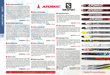 1 AtomicWorldcupSkateHardTrack Der Worldcup Skate Hard Track ist der Rennski speziell für kompakte Skating- langlaufSkI – skate sorgen der geringe Sidecut und die Weltcup-Base mit doppelter Laufrille. 5 SalomonS-LABSkateWarm 9 SalomonEquipe8Skate Loipen. Dieser Top-Ski ist extrastabil, extraleicht und extraschnell. Möglich machen das sein federleichter Nomex-Aufbau und seine Seitenwange aus Leichtholz, die beide für explosiven Abstoß sorgen. Für optimale Gleitphasen Die Skispitzen sind so konzipiert, dass sie auch auf hartem Untergrund nicht Top Performance Skating-Rennski, der versierte Athleten für harte/kompakte zu vibrieren beginnen. Das alles macht den Worldcup Skate Hard Track zum Schneeverhältnisse rüstet. Der neue, steife Nomex Kern verbesserte die Per- Der Equipe 8 Skate ist ein schneller und zuverlässiger Ski, der sich bei Ver- idealen Pro-Ski für Rennsportler und Weltcup-Athleten, die für kompakte Schneeverhältnisse perfekt ausgerüstet sein wollen. Nomex Featherlight Core, einsrennläufern großer Beliebtheit erfreut. Power Spannungsabstimmung, formance auf Hartschnee, während der Zeolit-Belag unvergleichlich schnelle WC-Race Profl, Belag Index 5000, Sidecut: 43.5-43.5-45 mm. D2FC - Digital Dynamic Flex Control, Densolite 3000 Kern, G4 Belag, Universal- Gleiteigenschaften bietet. Power Distribution Spannung für Skating, D2FC – Race-Tuning, DGM - Digital Grinding Measurement, Jarvelin Skating-Sidecut Digital Dynamic Flex Control, Steifer Nomex Kern, G5 Zeolit-Universalbelag, Längen: 173, 179, 185, 191 cm ATAB002034 € 399,95 Schutzfolie, World Cup Universalschliff, DGM – Digital Grinding Measurement, 42-44-43-45(/43) mm, Gewicht: 1270 g. 2 AtomicWorldcupSkateSoftTrack Längen: 170, 177, 182, 187, 192 cm + 192 cm Extra Hard SA35533 € 399,95 Der Worldcup Skate Soft Track ist der Rennski für weiche und gemischte A SalomonEquipe8VitaneSkateWomen Schneeverhältnisse. Dieser Top-Ski ist extrastabil, federleicht und ult- Skating Race Sidecut 44-43-44 mm, Gewicht: 1000 g. Längen: 174, 179, 186, 191 cm SA361789 € 199,95 raschnell. Möglich machen das sein federleichter Nomex-Aufbau und seine 6 SalomonS-LABSkateCold Ein schneller und stabiler Skatingski für Frauen, der schnelle Gleiteigenschaf- Seitenwange aus Leichtholz, die dem Ski extreme Torsionssteifgkeit und Top Performance Skating-Rennski, der versierte Athleten für kalte und kom- ten und Stabilität gewährleistet. Power Spannungsabstimmung, D2FC - Digital dynamischen Längsfex verleihen. Für noch mehr Rennperformance sind die pakte Schneeverhältnisse rüstet. Die Verbindung eines sehr leichten Nomex Dynamic Flex Control, Densolite 3000 Kern, G4 Belag, Universal-Race-Tuning, Skispitzen fexibel und bieten auch in weichen Schneebedingungen dyna- Kerns mit einem Zeolit-Belag sorgt für hohe Performance und unvergleich- DGM - Digital Grinding Measurement, Jarvelin Skating-Sidecut 42-44-43- mischen Flow. Der Worldcup Skate Soft Track ist der ideale Prof-Ski für lich schnelle Gleiteigenschaften. Power Distribution Spannung für Skating, 45(/43) mm, Gewicht: 1270 g. Rennsportler und Weltcup-Athleten, die für vielfältige Schneeverhältnisse Skating-Spannungsabstimmung für kalte Bedingungen, D2FC – Digital Längen: 174, 179, 186 cm 10 gerüstet sein möchten und besonders auf weichem Untergrund unschlagbare Dynamic Flex Control, Nomex Kern, G5 Zeolit-Kaltbelag, Schutzfolie, World SA361788 € 199,95 Performance erwarten. Nomex Featherlight Core, WC-Race Profl, Belag Index Cup-Schliff Kalt, DGM - Digital Grinding Measurement, Skating Race Sidecut 5000, Sidecut: 44-43-44 mm. 44-43-44 mm, Gewicht: 1000 g. B SalomonEquipe7Skate Längen: 172, 178, 184, 190 cm Längen: 170, 177, 182, 187, 192 cm ATAB002035 € 399,95 SA35527 € 399,95 Der stabile und leichtgängige Equipe 7 Skate begleitet dich bei deinen Skating- Fortschritten. Power Spannungsabstimmung, D2FC - Digital Dynamic Flex 3 AtomicRedsterSkate 7 SalomonS-LABSkateSG Control, Densolite 2000 Kern, G3 Belag, Universal-Race-Tuning, Verbreiterter Jarvelin Skating-Sidecut 42-45-43-47 mm, Gewicht: 1120 g. Wenn du nach einem kraftvollen, aber einfach zu laufenden Ski suchst, dann Top Performance Skatingski mit Wettkampf-erprobter Konstruktion, die spe- Längen: 161, 171, 181, 186, 191 cm ist der Redster Skate der richtige für dich. Denn er ist mit einem sehr leichten ziell auf weichere Schneeverhältnisse abgestimmt ist. Die optimierte Span- SA355279 € 149,95 Mexcell-Kern mit Nomex-Powerzelle ausgestattet, die den Ski superspritzig nungsabstimmung bietet eine zunehmende Torsion von Skispitze zu Skiende und -leicht macht. Kombiniert mit dem Redster-Profl und -Sidecut bietet und sorgt somit für bessere Beschleunigung auf weichem Schnee. Skating C SKITRABRaceAeroSkatingWarm/Cold der Ski einen dynamischen Abstoß und eine besonders lange Gleitphase. Power Distribution Spannung für weiche Schneeverhältnisse, D2FC - Digital Sehr leichter Rennski für Skating-Technik mit hervorragender Gleiteigenschaft PowerCell Kern, Race Profle, Belag Index 4000, Sidecut: 44-42-43,5 mm. Dynamic Flex Control, Nomex Kern, G5 Zeolit-Universalbelag, Schutzfolie, und sehr guter Stabilität. Seine zwei Führungsrillen garantieren beste Skikon- Längen: 172, 178, 184, 190 cm World Cup Universalschliff, DGM - Digital Grinding Measurement, Skating trolle und Laufruhe (kein “Schwimmen” bei harten Bedingungen), die SCARA- ATAB0020504 € 249,95 Race Sidecut 44,5-44-44,5 mm, Gewicht: 1000 g. Längen: 177, 182, 187, 192 cm BEO Technology ermöglicht besten seitlichen Abdruck und Kantendruck, die 4 AtomicProSkate SA355277 € 399,95 bei Bedarf nachgeschliffen werden kann. CARBON Verstärkungen auf komplet- ter Breite des Rennbelages. Die QUADRIAXIAL AERO TECH Bauweise, teilelasti- Der Pro Skate mit seinem ausgeprägten Sidecut bietet besonders leichtes 8 SalomonEquipeRSSkate sche erweiterte Skispannung für eine bessere Rückfederung, Steuerkontrolle Handling in der Loipe. Der le