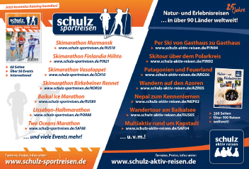 Jetzt kostenlos Katalog bestellen! Natur- und Erlebnisreisen … in über 90 Länder weltweit! WerkStatt Skimarathon Murmansk Per Ski von Gasthaus zu Gasthaus Running · Skiing · Cycling www.schulz-sportreisen.de/RUS18 www.schulz-aktiv-reisen.de/FIN04 Skimarathon Finlandia Hiihto Skitour über dem Polarkreis 2015 / 2016 www.schulz-sportreisen.de www.schulz-sportreisen.de/FIN21 www.schulz-aktiv-reisen.de/FIN92 68 Seiten Skimarathon Vasaloppet Patagonien und Feuerland Über 50 Events International www.schulz-sportreisen.de/SCH10 www.schulz-aktiv-reisen.de/ARG06 102 Skimarathon Birkebeiner Rennet Wandern auf den Azoren www.schulz-sportreisen.de/NOR30 www.schulz-aktiv-reisen.de/AZR05 Baikal Ice Marathon Nepal zum Kennenlernen www.schulz-sportreisen.de/RUS80 www.schulz-aktiv-reisen.de/NEP02 Lissabon-Halbmarathon Wandertour am Baikalsee www.schulz-sportreisen.de/POR88 www.schulz-aktiv-reisen.de/RUS05 260 Seiten Über 100 Reisen Two Oceans Marathon Multiaktiv rund um Kapstadt weltweit! www.schulz-sportreisen.de/SAF88 www.schulz-aktiv-reisen.de/SAF04 … und viele Events mehr! … u. v. m.! Running · Skiing · Cycling … Termine, Preise, Infos unter:ermine, Preise, Infos unter: T Termine, Preise, Infos unter: www.schulz-sportreisen.deww.schulz-sportreisen.deww.schulz-sportreisen.de w w www.schulz-aktiv-reisen.de Besuchen Sie unseren Onlineshop: