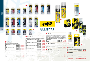 7 WAx A 9 gleitWax 114 8 B 9 TokoIrox Irox ist ein revolutionäres, sprühbares Heisswax. Es hat die selbe Performance 8 TokoNonFluoro und Abriebfestigkeit wie herkömmliches Heisswax und ist dabei sehr ein- fach und sauber in der Anwendung. In der Fluoro-Version mit noch besseren HydroCarbon-Wax für Trainingseinsätze und ambitionierte Freizeitsportler. Gleiteigenschaften, besonders bei warmen, nassen Bedingungen. 250 ml, NF Gelb (Schnee: 0°C bis -6°C, Luft: +10°C bis -4°C) Schnee: 0 bis -20°C 40g TO5501001 € 5,99 Irox TO5509780 € 16,95 7 TokoTriblocLF 120g TO5502001 € 10,95 IroxFluoro TO5509781 € 24,95 NF Rot (Schnee: -4°C bis -12°C, Luft: -2°C bis -11°C) Niedrigfuoriertes Renn- und Basiswax für JetStream. 40g TO5501002 € 5,99 A TokoXColdPowder C LF Gelb (Schnee: 0°C bis -6°C, Luft: +10°C bis -4°C) 120g TO5502002 € 10,95 Neu! Sehr hartes Hydro Carbon-Wax in Pulverform zum beimischen bei kalten, D 40g TO5501011 € 12,95 NF Blau (Schnee: -10°C bis -30°C, Luft: -9°C bis -30°C) aggressiven Schneeverhältnissen. 120g TO5502011 € 24,95 40g TO5501003 € 5,99 50g TO5509870 € 29,95 LF Rot (Schnee: -4°C bis -12°C, Luft: -2°C bis -11°C) 120g TO5502003 € 10,95 C HFRub-onWax 40g TO5501012 € 12,95 NF Schwarz (DLC Additiv) B TokoExpress 120g TO5502012 € 24,95 40g TO5501004 € 5,99 Hartes, hochfuoriertes Aufreibewax für alle Schneearten und Temperaturen. 25g TO5509181 € 14,95 LF Blau (Schnee: -10°C bis -30°C, Luft: -9°C bis -30°C) 120g TO5502004 € 10,95 Universal-Flüssigwax für alle Schneearten und Temperaturen. 40g TO5501013 € 12,95 All-in-One (Schnee: 0°C bis -30°C, Luft: 10°C bis -30°C) Schnee: 0°C bis -30°C 120g TO5502013 € 24,95 40g TO5501006 € 5,99 Mini75ml TO5509160 € 7,99 D ExpressBlocx LF Schwarz (DLC Additiv) 120g TO5502006 € 10,95 Pocket100ml TO5509165 € 12,95 Leichtfuoriertes Aufreibewax für alle Schneearten und Temperaturbereiche. 40g TO5501014 € 12,95 Hot Box & Cleaning Wax Maxi200ml TO5509170 € 14,95 Politur mittels Thermopad oder Tuch. 120g TO5502014 € 24,95 120g TO5502007 € 10,95 TF90Paste TO5509161 € 11,95 30g TO5509180 € 6,99 Besuchen Sie unseren Onlineshop: