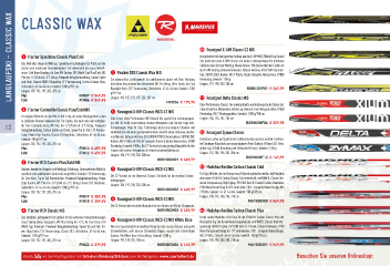 langlaufSkI – clasSic wax clasSic wax Ein universelles Leichtgewicht für ambitionierte Läufer mit Biss. Achtung, A RossignolX-IUMClassicC2NIS 1 FischerSpeedmaxClassicPlus/Cold Ausgestattet mit dem gleichen Aufbau wie die X-IUM WCS (World Cup Series) Ski, bietet der neue X-IUM-Classic ein neues Leistungsniveau für erfahrene Das Maß aller Dinge im Weltcup: Speedmax-Technologien für Profs auf der Skifahrer die nicht auf Weltcup-Niveau fahren. Mit dem entfernten Carbon ist Suche nach maximaler Geschwindigkeit. Für universelle bis nasse Verhält- der X-IUM Skating Fehlerverzeihender. Sidecut 44//mm, ACTIV’CAP Konstruk- nisse. Cold Base Bonding, Air Core HM Carbon, DTG World Cup Plus/Cold, WC 5 FischerCRSClassicWaxNIS tion, SUPRA EDGE Kanten, NIS 7 Platte, fache Schaufel, Nomex Kern, K7000 Plus bis -5°C/Cold ab -2°C Belag, Prewaxed Belagsbehandlung, Carbon Spitze Rennbelag, Gewicht: 1100 g. und Ende, Classic 9Q/812 Biegelinie, CFC Vermessung, Fischer Carbon Fibre, hier fallen die persönlichen Bestzeiten! WC Pro Belag, Ultra Finish, Air Core Längen: 191, 198, 203, 208 cm Seitenform: 41-44-44 mm, Gewicht: 1030 g/197 cm. RORHDCP01 € 349,99 Basalight Kern, CFC Vermessung, Seitenform: 41-44-44 mm, Gewicht: 1350 Längen: 187, 192, 197, 202, 207 cm g/197 cm. FIN07 € 549,95 Plus B RossignolDeltaClassicNIS Längen: 182, 187, 192, 197, 202, 207 cm FIN06 € 549,95 Cold FIN256 € 199,95 Race Performance Classic. Der unkomplizierte und leistungsstarke Classicski. 2 FischerCarbonliteClassicPlus/ColdNIS 6 RossignolX-IUMClassicWCS-C1NIS Sidecut 44//mm, Wabenkern, Active Cap, Numeric Finsh Belagsstruktur, K7000 Ein original Rennski aus der RACE CODE Linie, der seine Überlegenheit schon Elite-Level, High-Performance-WC Klassik Ski speziell für Leistungssport- Rennbelag, NIS 7 Bindungsplatte, Gewicht: 1200 g/198 cm. Längen: 186, 196, 201, 206 cm in zahllosen Rennen bewiesen hat. Für Läufer, die noch sehr viel vorhaben. ler. Mit 3D-Profl Konstruktion, Nomex Wabenkern und Control Edge ABS- RORHCWF06 € 259,95 12 Air Core Carbonlite Kern, WC Plus bis -5°C/Cold ab -2°C Belag, Prewaxed Seitenwangen. Neue Bi-Edge-Technologie bietet eine längere Chamber und Belagsbehandlung, Carbon Spitze und Ende, Speed Tip to Tail, CFC Vermes- sung, Power Edge Kanten, Classic 81 Biegelinie, Seitenform: 41-44-44 mm, verbindet sich mit einer spezialisierten Kick-Zone für einen stärkeren, leichte- C RossignolZymaxClassic ren Abdruck. Sidecut 44// mm, 3D CARBON PROFIL Konstruktion, SUPRA EDGE Gewicht: 980 g/197 cm. Kanten, NIS 7 Platte, ACTIV’CAP Laminate, fache Schaufel, Nomex Kern, K7000 Einfaches Laufen und Spaß in der Tradition der klassischen Technik. Exzellen- Längen: 187, 192, 197, 202, 207 cm Rennbelag, Gewicht: 1000 g. Die C1-Version hat eine geringe Biegehöhe für den ter Einsteiger Klassikski zum unschlagbaren Preis! Sidecut 44//mm, LDC-Kern, Plus FIN13 € 459,95 Einsatz mit hartem Steigwachs bei Pulverschneeverhältnissen. Active Cap, K7000 Rennbelag mit Steinschliff-Finish. Gewicht: 1260 g. Cold FIN12 € 459,95 Längen: 186, 191, 198, 203, 208 cm Längen: 176, 186, 196, 201, 206 cm RORHDCN01 € 449,99 RORHCWF12 € 149,95 3 FischerRCSClassicPlus/ColdNIS Bestens bewährter Siegerski mit Weltcup-Erfahrung. Eine exzellente Wahl für 7 RossignolX-IUMClassicWCS-C2NIS D MadshusRedlineCarbonClassicCold sportlich sehr ambitionierte Läufer mit ausgefeilter Technik. CFC Vermessung, Die C2-Version ist ein Universal-Classic-Ski ideal für die meisten Schnee- Für Top-Athleten, die im Rennen neue Rekorde aufstellen wollen, hat Madshus Air Core Kern, Tip to Tail Konstruktion, Prewaxed Belagsbehandlung, Power bedingungen. den neuen REDLINE Carbon Classic Cold entwickelt. emPOWER, Classic Uni- Edge Kanten, WC Plus bis -5°C/Cold ab -2°C Belag, Classic 812 Biegelinie, Längen: 186, 191, 198, 203, 208 cm versal Vorspannung Slight Splay, PR 100X Kern & Triaxial-Carbon-Bauweise, Seitenform: 41-44-44 mm, Gewicht: 1080 g/197 cm. RORHDCN02 € 449,99 P200 Nano Black Belag für 0°C und kälter, CAD – Computer Aided Design, NIS Längen: 187, 192, 197, 202, 207 cm 7 Platte, Sidecut: 44-42-44 mm, Gewicht: 900 g/190 cm. Plus FIN19 € 359,95 8 RossignolX-IUMClassicWCS-C3NIS Längen: 190, 195, 200, 205, 210 cm Cold FIN18 € 359,95 MA1830000 € 549,95 Die C3-Version hat eine hohe Biegelinie für den Einsatz mit Klister Steigwachs. 4 FischerRCRClassicNIS RORHDCN03 € 449,99 E MadshusRedlineCarbonClassicPlus Das beliebte Leichtgewicht ist optimal für die extremen Herausforderungen 9 RossignolX-IUMClassicWCS-C3NISWhiteBase In der neuen Madshus RED Linie ist der REDLINE Carbon Classic Plus der eines Skimarathons konzipiert. WC Plus Belag bis -5°C, Air Core Kern, DTG klassische Top-Ski für wärmere Temperaturen. emPOWER, Classic Hoch Vor- World Cup Universal, Prewaxed Belagsbehandlung, Speed Tip und Tail, Po- Neustes Spezialmodell mit weißem Belag für sehr nassen Schnee und große spannung Distinct Splay, PR 100X Kern & Triaxial-Carbon-Bauweise, P200 wer Edge Kante, CFC Vermessung, Classic 812, Seitenform: 41-44-44 mm, Schneefocken, sehr nassen Schneefall, Regen, nassen und schmutzigen Nano Transparent Belag für -5°C und wärmer, CAD – Computer Aided Design, Gewicht: 1190 g/197 cm. Schnee. Mit White Base Tefon Belag. Gewicht: 1000 g. NIS 7 Platte, Sidecut: 44-42-44 mm, Gewicht: 900 g/190 cm. Längen: 187, 192, 197, 202, 207 cm Längen: 191, 198, 203, 208 cm Längen: 190, 195, 200, 205, 210 cm FIN22 € 279,95 RORHDCN04 € 449,99 MA1830001 € 549,95 Kaufe Ski im Set-Konfgurator mit Schuhen/Bindung/Stöcken zum Vorteilspreis: www.sportalbert.de Besuchen Sie unseren Onlineshop: