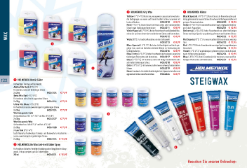 3 HOLMENKOLGripWax 4 HOLMENKOLKlister Yellow (-1°C/+4°C), Klisterartig, vorzugsweise einzusetzen bei wechseln- Black Special (+10°C/-1°C), Bester Einsatz als Beimischung bei grob- den Bedingungen aus neuem und feinem feuchten Schnee zusammen mit körnig gefrorenem bis nassem Schnee für verbesserte Gleiteigenschaften und härteren Wachsen. HO24210 € 8,99 geringere Schmutzaufnahme. HO24230 € 12,95 Red (-1°C/+2°C), Bester Einsatz bei feinem altem oder transformiertem Silber (-1°C/+3°C), Für warmen Neuschnee sowie aufgetauten feinkörni- Schnee sowie feinkörnigem Kunstschnee. HO24211 € 8,99 gen Schnee, Pappschnee. HO24231 € 12,95 Violet Special (-2°C/ 0°C), Breiter Einsatzbereich von (fallendem) Neu- Universal (-4°C/+4°C), Breiter Einsatzbereich von altem feinkörnigen WAx schnee bis zu feinem altem oder transformiertem Schnee und Kunstschnee. Schnee und eisiger Spur bis zu grobkörnig gefrorenem und feuchtem Schnee. HO24232 € 12,95 € 8,99 HO24212 Violet (0°C), Für feuchten Neuschnee um den Gefrierpunkt. HO24233 € 12,95 HO24213 € 8,99 Rot Special (0°C/-2°), Für neuen feuchten Schnee und nasse, wässrige Spur. 1 Blau Special (-6°C/-1°C), Bei hoher Luftfeuchtigkeit und leicht spie- Rot (+3°C/-2°C), Breiter Einsatzbereich von eisiger Spur bis zu grobkörnigem geliger Spur, auch zum Abdecken weicherer Wachse zur Verbesserung der Nassschnee. HO24234 € 12,95 Gleiteigenschaften. HO24216 € 8,99 Violet (+2°C/-4°C), Für grobkörnigen, gefrorenen Schnee. Auch als Grund- Blau Extra (-6°C/-2°C), Breiter Einsatzbereich bei trockenem, neuem und wachs für Nassschnee geeignet. HO24236 € 12,95 feinkörnigem Pulverschnee und Kunstschnee. HO24217 € 8,99 Blau (-20°C/-3°C), Breiter Einsatzbereich bei trockenem, neuem und fein- Blau (-7°C/-3°C), Für trockenen, neuen und wenig transformierten oder körnigem Pulverschnee und Kunstschnee. HO24237 € 12,95 sehr kalten feinkörnigen Schnee. HO24218 € 8,99 Grün (-20°C/-6°C), Für trockenen, kalten neuen und wenig transformierten 2 Schnee. HO24219 € 8,99 Base Grundwachs für erhöhte Abriebfestigkeit der Gripwachse bei altem und aggressivem Schnee sowie Kunstschnee. HO24224 € 8,99 122 1 HOLMENKOLNordicGlider SteigWAx Hochwertiges Trainings und Basiswachs. Alpha Mix Gelb (0°C/-4°C) Für weichen, neuen und feinkörnigen Schnee. 2x35g HO24104 € 7,99 Beta Mix Rot (-4°C/-14°C) Für trockenen oder alten bis aggressiven Schnee. 2x35g HO24114 € 7,99 Ultra Mix Blau (-8°C/-20°C) Für feuchten bis nassen sowie körnigen bis grobkörnigen Schnee. 2x35g HO24124 € 7,99 Worldcupmix Cold 3 Set bestehend aus: Rot -4C°/-14C° und Blau -8°C/-20°C 2x35g HO24127 € 7,99 Worldcupmix Wet Set bestehend aus: Gelb 0C°/-4° und Rot -4C°/-14C° 2x35g HO24128 € 7,99 Fluormix (0°C/-14°C) Leicht fuoriertes hochwertiges Trainings- und Basiswachs für feuchten bis nassen sowie körnigen bis grobkörnigen Schnee. 2x35g HO24134 € 11,95 2 HOLMENKOLNoWaxAnti-Ice&GliderSpray Für Freude am Skilaufen. Verhindert Eisbildung an den Steigzonen der Schup- 4 penski. Sehr gut geeignet auch für Schneeschuhe. 200ml HO24031 € 15,95 Besuchen Sie unseren Onlineshop: