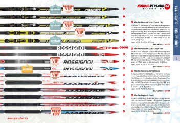 1 2 F MadshusNanosonicCarbonClassicCold 3 3D-geformter PR-100X-Kern und die Triaxial-Carbon-Bauweise garantieren Präzision bei Flex, Vorspannung und Druckverteilung. Damit bietet er Weltcup- langlaufSkI – clasSic wax Performance für den Endverbraucher. Der Nanosonic Carbon Classic Cold 4 verfügt über eine lange, fache Vorspannung mit außergewöhnlicher Kraft- übertragungskapazität bei 0°C und kälter. emPOWER, Classic Universal Vorspannung Slight Splay, PR 100X Kern & Triaxial-Carbon-Bauweise, P190 Nano Cold Belag für 0°C und kälter, NIS 7 Platte, Sidecut: 44-42-44 mm, 5 Gewicht: 1000 g/190 cm. Längen: 180, 185, 190, 195, 200, 205, 210 cm MA1840005 € 489,95 6789 G MadshusNanosonicCarbonClassicPlus Rennski für warme Bedingungen. Er hat eine höhere Vorspannung, die bei A Temperaturen von 0°C und höher eine überlegene Kraftübertragungskapazität bietet. Außerdem minimiert es die Saugwirkung und den Wasserflm zwischen Belag und Schnee. emPOWER, Classic Hoch Vorspannung Distinct Splay, PR 13 B 100X Kern & Triaxial-Carbon-Bauweise, P190 Nano Plus Belag für -5°C und wärmer, NIS 7 Platte, Sidecut: 44-42-44 mm, Gewicht: 1000 g/190 cm. Längen: 180, 185, 190, 195, 200, 205, 210 cm MA1840006 € 489,95 C H MadshusHypersonicCarbonClassic D Der Hypersonic Classic kombiniert die Weltcup-Eigenschaften des Triaxial- Carbon-Chassis mit dem preiswerten, leichten und reaktionsfreudigen Polycell-Schaumkern. Mit seinem langen, fachen Vorspannungsprofl und der neuen Schaufelform bietet er außergewöhnliche Kraftübertragungskapa- E zitäten. emPOWER, Classic Universal Vorspannung Slight Splay, PR 90 Kern & Triaxial-Carbon-Bauweise, P190 Nano Universal Belag, NIS 7 Platte, Sidecut: 44-42-44 mm, Gewicht: 1050 g/190 cm. F Längen: 180, 185, 190, 195, 200, 205, 210 cm MA1840008 € 389,95 I MadshusMegasonicClassic G Mit seinem leistungsfähigen, 3D-geformten Kern ist der neue Megasonic Classic genau der richtige Ski für Volks- und Fitnessläufer. Die qualitativ hochwertige Torsion-Cap-Konstruktion und der Polycell-Schaumkern vermit- H teln ein verlässliches Gefühl für den Schnee, so dass Sie Ihre Langlauftechnik zum vernünftigen Preis perfektionieren können. Polycellkern, P170 Belag, NIS 7 Platte, Sidecut: 44-42-44 mm, Gewicht: 1150 g/190 cm. I Längen: 180, 185, 190, 195, 200, 205, 210 cm MA1840011 € 259,95 www.sportalbert.de