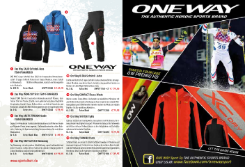 8 Bekleidung Men D 6 OneWayCALIOSoftshell-Hose TEAMFRANKREICH ONE WAY 3-Layer Softshell-Hose CALIO der französischen Nationalmann- A OneWayOLORASoftshellJacke schaft! 3-lagiges Softshell-Material mit Singtex Membran, innere Schicht Leichte und elastische 3 Lagen-Softshell-Jacke mit wasserdichter, atmungs- 133 mit Vlieseinsatz, 10.000 mm Wassersäule, elastisch und atmungsaktiv aktiver Membran, vorgeformte Ärmel, elastische, atmungsaktive Einsätze am in der Rückseite. Rücken und Zwei-Wege-Reißverschluss vorne. Gr.XXS-XL Farbe:Black OW712000 € 149,95 Gr.S-XL Farbe:Red OW711161-47 € 179,95 7 OneWayPRIMESKYShirtTEAMFRANKREICH B OneWayCOMPACTFleece-Weste Original TEAM Shirt der französischen Nationalmannschaft! Warmes, elas- Weiche, warme Fleece-Weste -Vorderseite aus winddichter Microfaser mit tisches Shirt aus Thermo Stretch, innen gebürstet und dünne Flachnähte zwei Reißverschlusstaschen. Kordelzug am Saum sorgt für eine optimale Wei- für optimalen Komfort. Kurzer Reißverschluss am Hals mit Innenleiste und tenregulierung und refektierende Elemente machen die Weste zum idealen Kinnschutz. Zusätzlichen Wärmeschutz gewährleisten die Daumenschlaufen. Begleiter für alle sportlichen Aktivitäten... Gr.S-XL Farbe:Yello OW713062 € 79,95 Gr.S-XXL Farbe:Black OW711200 € 79,95 8 OneWayARCTICTENSIONHoodie C OneWaySHIFTERTights TEAMFRANKREICH Tight aus elastischem Thermogewebe, innen gebürstet mit Mesheinsatz für ei- Original TEAM Hoodie der französischen Nationalmannschaft! Warmes Hoodie nen optimalen Feuchtigkeitstransport. Mit einem Kordelzug ist die Taillenweite aus Polyester-Fleece, innen angeraut, Reißverschlusstasche auf der Rück- verstellbar und kurze Reißverschlüsse an den Fußgelenken und Flachnähte seite, Kordelzug für Kapuzeneinstellung, Daumenschlaufen für zusätzlichen optimieren die hautnahe Passform. Wärmeschutz. Gr.S-XL Farbe:Black OW712083 € 79,95 Gr.S-XL Farbe:Black,Blue OW711231 € 89,95 D OneWayTHUNDERPants 9 OneWayFASTCATCH2Rennanzug Softshell Pants aus einem 3-Schicht-Softshell Gewebe mit Membran und Top Rennanzug mit sehr sportiver Schnittführung, super Funktionalität und innen weich angeraut. Die Hose hat eine Cargotasche am linken Oberschenkel bester Passform. 4 Way Stretch Material für optimale Bewegungsfreiheit. und eine Netztasche auf dem rechten Oberschenkel sowie einen regulierbaren Silicon Abschlüsse sorgen für den perfekten Halt. Hosenbund. Ideal für alle sportlichen Aktivitäten im Winter. Gr.S-XL Farbe:Black OW710010 € 179,95 Gr.S-XL Farbe:Black OW712106 € 139,95 www.sportalbert.de
