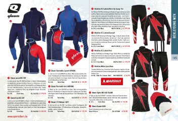 1 5 1 MadshusXCCustomWarmUpAnzug-Set 2 Der Madshus TEAM Warm Up Anzug mit Norweger Flagge bestehend aus Jacke und Hose. Warme Jacke aus einem winddichten Material am Vorderteil mit auf- gerauter Innenseite, aufgerautes Thermo Material am Rücken – bietet eine her- vorragende Temperaturregulierung, verstellbare Gummikordel am Saum. Warme 2 Hose aus winddichtem Material auf der Vorderseite mit aufgerauter Innenseite, aufgerautes Thermo Material auf der Rückseite bietet eine hervorragende Tempe- raturregulierung, vorgeformte Knie für beste Bewegungsfreiheit, durchgehender RV an beiden Seiten, abnehmbare Träger, Gummibund mit Kordelzug. Bekleidung Men Gr.S-XL,Farbe:Black MA7418100_2 € 379,95 2 MadshusXCCustomRacesuit Madshus TEAM Rennanzug mit Norweger Flagge. Jersey aus einem sehr wei- chen elastischen Material, welches sich wie eine 2. Haut trägt, vorgeformte Ärmel bieten optimale Bewegungsfreiheit, perfekte Passform. Tight aus ei- nem sehr weichen elastischem Material, perfekte Passform bietet optimale Bewegungsfreiheit. 6 Gr.S-XL,Farbe:Black MA7418103_4 € 219,95 3 MadshusXCCustomVest 1 Madshus TEAM Weste mit Norweger Flagge. Warme Weste aus winddichtem Material am Vorderteil mit aufgerauter Innenseite, aufgerautes Thermo Material am Rücken, hervorragender Temperaturregulierung, verstellbarer Gummikordel 145 am Saum. Gr.S-XL,Farbe:Black MA7418101 € 159,95 4 7 4 MadshusMützeLycraRace 3 3 QloomThermoliteJacketHOPKINS Für wahre Madshus Fans. Formschöne fache Rennmütze, doppelt im Stirnbe- reich und Lycraeinsatz für bessere Atmungsaktivität, edlem seitlich gestickten LL-Jacke aus der Serie RADIATOR von Qloom. Wind-und wasserdichtes Ma- Madshus Logo. terial in Kombination mit Powerstretchmaterial, Isolierung von Thermolite Gr:M,L,Farbe:Rot,Schwarz,Weiß MA1803020 € 24,95 1 QloomJacketBIGSKY vorn und in den Ärmeln, feste Kapuze, weiche Ärmel und Saumabschlüsse, LL-Jacke aus der Serie MY GUARD von Qloom. 3-Schicht Softshellmembran Front-Reißverschluss mit Kinnschutz. GL143012 € 159,95 Gr.S-XL Farbe:Navy aus winddichtem und wasserdichtem Material, in Kombination mit einem gebürstetem Stoff für eine optimale Thermoregulation und Bewegungsfreiheit, 4 QloomThermoliteVestHOPKINS 360 Grad Schnittkonstruktion, 2 Seitentaschen mit Reißverschluss, Handy- tasche innen, vorgeformte Ärmel, eng anliegender Kragen, Kinnschutz, LL-Weste aus der Serie RADIATOR von Qloom. Wind und wasserdichtes refektierende Elemente. Material in Kombination in Powerstretchmaterial, Isolierung von Thermolite, 6 QloomTightsMAYJORISLAND Gr.S-XL Farbe:Navy GL144032 € 179,95 feste Kapuze, weiche Ärmel und Saumabschlüsse, Front-Reißverschluss mit Kinnschutz. LL-Tights aus der Serie THE MID´S von Qloom. Gebürstetes Powerstretchma- 2 QloomPantBIGSKY Gr.S-XL Farbe:Navy GL143022 € 129,95 terial, 360 Grad Schnittkonstruktion, weicher Stoff in der Taille, angenehmes 4 LL-Hose aus der Serie MY GUARD von Qloom. 3-Schicht Softshellmembran aus Tragegefühl, Reißverschluss am Beinabschluss. GL142072 € 119,95 Farbe:Navy Gr.S-XL winddichtem und wasserdichtem Material, in Kombination aus gebürstetem 5 Qloom1/2MidlayerHUTT Stoff für eine optimale Thermoregulation und Bewegungsfreiheit, 360 Grad LL-Shirt aus der Serie THE MID´S von Qloom. Leichtes Stretchgewebe, 360 Schnittkonstruktion, elastische Taille, Stretch im Schritt, Antirutschgummi Grad Schnittkonstruktion, 1/2 Reißverschluss mit Kinnschutz, normale Kra- 7 QloomBeanieOHAU an den Beinabschlüssen. genhöhe, weiche „Flatlocks“. Gloom Strickmütze passend zur Qloom Serie. Gr.S-XL FarbeNavy GL144042 € 129,95 Gr.S-XL Farbe:Navy GL142062 € 119,95 Farbe:Hibiscus GL145020 € 39,95 3 www.sportalbert.de