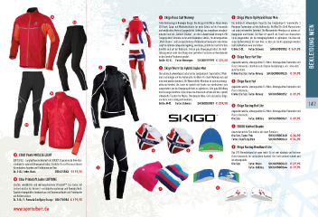 B 1 SkigoRaceSuitNorway 3 SkigoWarmUpHybridHoseMen C 1 Toller Rennanzug im Norweger Design. Der Anzug ist mit Micro-Fleece innen, Die technisch aufwendigste Hose für den Langlaufsport. Superleichte 3 3D-Druck, Zipper mit Windschutzleiste für mehr Schutz auf der Innenseite Membran Technologie auf der Außenseite. No Wind Pro Shell Material vorn und winddichten Material ausgestattet. Gefertigt aus innovativen aerodyna- und innen mit windtex laminiert. Die Wasserdichte Membran ist extrem at- mischer Stoff mit „Golfball-Struktur“, der den Luftwiderstand verringert. Mit mungsaktiv und fexibel. Die Hose ist speziell mit Panels aus elastischem Compressions Elemente an den entscheidenden Stellen. Ein atmungsaktiver Lycra ausgestattet, um die Bewegungsfreiheit zu optimieren. Die Hose hat „Mesh Rücken“ und lasergeschnittene Ventilationsöffnung unter den Armen einen Reißverschluss bis zum Knie, so dass sie leicht ausgezogen werden sorgt für optimale Temperaturregelung. Eine kleine, praktische Tasche für Gels kann. Refektoren vorn und hinten. Bekleidung Men befndet sich auf der Rückseite. Extrem gute Bewegungsfreiheit. Die Naht- Größe:S-XL Farbe:Schwarz SKIGO55552 € 169,95 führung wurde unter Beachtung einer perfekten Passform und Aerodynamik an den besten Positionen gesetzt. 4 SkigoRaceHatStar Größe:XS-XL Farbe:Norwegen SKIGO99999 € 339,00 Angenehm weiche, atmungsaktive LL-Mütze. Atmungsaktive Rennmütze mit 2 2 SkigoWarmUpHybridJackeMen Fleece-Innenseite, erhältlich in der Damen-Ausführungen, mit „silver dots“, gute Passform. Die technisch aufwendigste Jacke für den Langlaufsport. Superleichte 3 Mem- Größe:OneSizeFarbe:Norway SKIGO500052S € 39,95 bran Technologie auf der Außenseite. No Wind Pro Shell Material vorn und innen mit windtex laminiert. Die Wasserdichte Membran ist extrem atmungs- 5 SkigoRaceHat aktiv und fexibel. Die Jacke ist speziell mit Panels aus elastischem Lycra Angenehm weiche, atmungsaktive LL-Mütze. Atmungsaktive Rennmütze mit ausgestattet, um die Bewegungsfreiheit zu optimieren. Sehr gute Belüftung Fleece-Innenseite. E durch lasergeschnittene Löcher unter den Armen und auf dem Rücken. Speziell Größe:OneSizeFarbe:Norway SKIGO500052 € 39,95 entwickelte Taschen für Wachs, Stirnlampen-Akku, Gels und andere Dinge, um diese zum Training mitzunehmen. Größe:M-XL Farbe:Schwarz SKIGO55551 € 299,95 147 6 SkigoRacingHatLite Angenehm weiche, atmungsaktive LL-Mütze. Atmungsaktive Rennmütze mit Fleece-Innenseite . OneSize Farbe:Hellblau SKIGO500061 € 39,95 D 7 SKIGOKnittedBeanie Angenehm weiche Strickmütze mit super Passform. OneSize,Farbe:Pink SKIGO500348 € 34,90 Farbe:Blue/Turq./Pink SKIGO500063 € 34,90 8 SkigoRacingHeadbandLite 4 5 Das LITE Rennstirnband ist super leicht. Es ist sehr elastisch und hat eine D ODLOPantsMUSCLELIGHT 6 Fleece-Innenseite für zusätzlichen Komfort. Der Stoff trocknet schnell und SOFTSHELL - Langlaufhose kombiniert mit JERSEY. Ergonomische Knie-Kon- ist atmungsaktiv. struktion für optimale Bewegungsfreiheit. Seitliche 75-cm-Reissverschlüsse OneSize Farbe:Weiss SKIGO500060 € 29,95 für einfaches Anziehen und Refektoren am Bein. 3 Farbe:Hellblau SKIGO500064 € 29,95 Gr.S-XL,Farbe:Black OD621862 €119,95 E OdloPrimaloftJackeLOFTONE Leichte, winddichte und wärmeisolierende Primaloft Eco-Jacke mit ® Jersey-Einsätze für bessere Feuchtigkeitsregulierung und Beweglichkeit. 7 8 Sportuhr-kompatibler Armabschluss mit Daumenschlaufe und Fronttasche mit Reißverschluss. Gr.S-XL,F.:FormulaOne/SpicyOrange OD670082 € 179,95 www.sportalbert.de