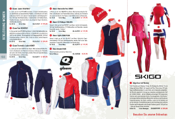1 QloomJacketHEAVENLY 4 QloomThermoliteVestHONEY 7 LL-Jacke aus der Serie MY GUARD von Qloom. 3-Schicht Softshellmembran LL-Weste aus der Serie RADIATOR von Qloom. Wind-und wasserdichtes Ma- Bekleidung woMen heit, 360 Grad Schnittkonstruktion, 2 Seitentaschen mit Reißverschluss, Gr.XS-XL Farbe:Navy GL143021 € 129,95 5 1 terial in Kombination mit Powerstretchmaterial, Isolierung von Thermolite aus winddichtem und wasserdichtem Material, in Kombination mit einem vorn und in den Ärmeln, feste Kapuze, Front-Reißverschluss mit Kinnschutz. gebürstetem Stoff für eine optimale Thermoregulation und Bewegungsfrei- Handytasche innen, vorgeformte Ärmel, eng anliegender Kragen, Kinnschutz, 5 Qloom1/2MidlayerNIBLOCK refektierende Elemente. GL144031 € 179,95 Farbe:Navy Gr.XS-XL Damen LL-Shirt aus der Serie THE MID´S von Qloom. Leichtes Stretchgewebe, 360 Grad Schnittkonstruktion, 1/2 Reißverschluss mit Kinnschutz, normale 2 QloomPantHEAVENLY Kragenhöhe, weiche „Flatlocks“. GL142091 € 119,95 LL-Hose aus der Serie MY GUARD von Qloom. 3-Schicht Softshellmembran aus Gr.XS-XL Farbe:Navy winddichtem und wasserdichtem Material, in Kombination aus gebürstetem Stoff für eine optimale, Thermoregulation und Bewegungsfreiheit, 360 Grad Schnittkonstruktion, elastische Taille, Stretch im Schritt, Antirutschgummi Damen LL-Tights aus der Serie THE MID´S von Qloom. Gebürstetes Power- an den Beinabschlüssen. stretchmaterial, 360 Grad Schnittkonstruktion, weicher Stoff in der Taille, Gr.XS-XL Farbe:Navy GL144041 € 129,95 6 QloomTightsGONGPEAK angenehmes Tragegefühl, Reißverschluss am Beinabschluss. 3 QloomThermoliteJacketHONEY Gr.XS-XL Farbe:Navy GL142071 € 119,95 LL-Jacke aus der Serie RADIATOR von Qloom. Wind-und wasserdichtes Ma- 7 QloomBeanieOHAU terial in Kombination mit Powerstretchmaterial, Isolierung von Thermolite vorn und in den Ärmeln, feste Kapuze, weiche Ärmel und Saumabschlüsse, Gloom Strickmütze passend zur Qloom Serie. GL145020 € 39,95 2 Farbe:Hibiscus Front-Reißverschluss mit Kinnschutz. 160 Gr.XS-XL Farbe:Navy GL143011 € 159,95 3 1 SkigoRaceSuitNorway Toller Rennanzug im Norweger Design. Die Norwegische Athleten Therese Johaug läuft dieses Modell. Der Anzug ist mit Micro-Fleece innen, 3D-Druck, Zipper mit Windschutzleiste für mehr Schutz auf der Innenseite und winddich- ten Material ausgestattet. Gefertigt aus innovativen aerodynamischer Stoff mit „Golfball-Struktur“, der den Luftwiderstand verringert. Mit Compressions Elemente an den entscheidenden Stellen. Ein atmungsaktiver „Mesh Rücken“ 1 und lasergeschnittene Ventilationsöffnung unter den Armen sorgt für optimale 4 Temperaturregelung. Eine kleine, praktische Tasche für Gels befndet sich auf der Rückseite. Die Nahtführung wurde unter Beachtung einer perfekten Passform und Aerodynamik an den besten Positionen gesetzt. Fällt groß aus – bitte eine Nummer kleiner bestellen! 2 6 Größe:S-L Farbe:Norwegen SKIGO99999 € 339,00 Besuchen Sie unseren Onlineshop: