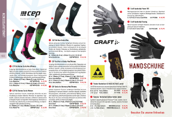 3 CraftHandschuhPowerWS 3 Windstopperhandschuh Power der absoluten Spitzenklasse. Abgestimmt auf die Craft Kollection. Vorgeformt, Windstoppereinsätze, Silikonbesatz für LangLaufSocken 1 2 3 4 CraftHandschuhTouring CA1903488 € 29,95 besseren Grip, Sublimationsprint. CA193384 € 49,95 Gr.XS/7-XXL/12Farbe:Black/White 5 4 Warmer Handschuh mit Neopren-Bündchen, elastischem Einsatz am Hand- gelenk und Clarino im Handinneren. Gr.XS/7-XXL/12Farbe:Black 3 CEPSkiRaceSocksMen 4 Optimale anatomische Passform, hochwertigste Materialien und beste Ver- arbeitung für höchste Haltbarkeit, Mikrofaser für angenehmen Tragekom- fort, extrafache Zehennaht, dünnes Funktionsgestrick für eine kompakte Passform der Skistiefel, Polsterzonen zur Druckentlastung, antibakterielle, geruchshemmende Wirkung, Feuchtigkeitsmanagement dank hydrophiler Ausrüstung. 182 Gr.3(Waden=32-39cm),4(Waden39-44cm),5(45-50cm) + CEPWP52G2 € 49,90 Farbe:Black/Green 4 CEPRunMerinoSocksMen/Women 1 Einzigartige Materialkombination aus bester Merino-Wolle, Polyprophylen und Handschuhe 1 CEPSkiMerinoSocksMen/Women Hightech Elasthan, optimale anatomische Passform und höchste Haltbarkeit, Einzigartige Materialkombination aus bester Merino-Wolle, Polyamid und extrafache Zehennaht, perfekte Thermobalance für den Ausdauersport, her- ausragendes Klima- und Feuchtigkeitsmanagement, ideal platzierte Polster- Hightech Elasthan, optimale anatomische Passform und höchste Haltbarkeit, extrafache Zehennaht, perfekte Thermobalance dank Merinowolle, heraus- zonen zur Druckentlastung, reduzierte Blasenbildung durch enganliegendes ragendes Klima- und Feuchtigkeitsmanagement, dünnes Funktionsgestrick Fußteil, antibakterielle, geruchshemmende Wirkung. M:Gr.3(Waden=32-39cm),4(Waden39-44cm),5(45-50cm) für direkte Kraftübertragung, antibakterielle, geruchshemmende Wirkung. Farbe:Antracite/Black CEPWP50CA € 49,90 M:Gr.3(Waden=32-39cm),4(Waden39-44cm),5(45-50cm) W:Gr.2(Waden=25-31cm),3(Waden=32-38cm),4(39-44cm) Farbe:Black/Azur CEPWP50AB € 49,90 W:Gr.2(Waden=25-31cm),3(Waden=32-38cm),4(39-44cm) Farbe:Antracite/Black CEPWP40CA € 49,90 1 FischerHandschuhXCRACE/XCRACEJunior Farbe:Black/Azur CEPWP40AB € 49,90 2 5 CEPSocksforRecoveryMen/Women FISCHER Rennhandschuh der absoluten Spitzenklasse! Oberhand: 100% PES, 2 CEPSkiThermoSocksWomen Optimale anatomische Passform, hochwertigste Materialien und beste Handrücken winddicht, Clarino im Innenhand-Bereich, Neopren-Bündchen. FI17947 € 24,95 E:Gr.6,5-11,0 Farbe:Schwarz Verarbeitung für maximale Haltbarkeit, extrafache Zehennaht, dauerhaftes Optimale anatomische Passform, hochwertigste Materialien und beste Klimamanagement, antibakterielle, geruchshemmende Wirkung, anatomi- J:Gr.4,0-6,0 Farbe:Schwarz FI17948 € 22,95 Verarbeitung für höchste Haltbarkeit, Mikrofaser für angenehmen Trage- sche Fußpolsterung, aktive Muskelregeneration nach dem Sport, schnelleres komfort, extrafache Zehennaht, wärmendes, mitteldickes Funktionsgestrick Warm-Up vor dem Sport, beschleunigter Abtransport von Schlackenstoffen 2 NonameHandschuhAction/ActionJunior für bequeme Passform und angenehme Thermoregulierung, Polsterzonen zur und Laktaten, perfekt als Reisestrumpf geeignet. Sportlicher Langlaufhandschuh mit Thinsulate™ Futter, Synthetic Leder In- Druckentlastung, antibakterielle, geruchshemmende Wirkung, Feuchtigkeits- M:Gr.3(Waden=32-39cm),4(Waden39-44cm),5(45-50cm) nenhand für einen guten Griff, lang haltbar, waschbar, elastischer Strickbund management dank hydrophiler Ausrüstung. Farbe:Black CEPWP505R € 39,90 mit Klettverschluss. Gr.2(Waden=25-31cm),3(Waden=32-38cm),4(39-44cm) W:Gr.2(Waden=25-31cm),3(Waden=32-38cm),4(39-44cm) E:Gr.6-13,Farbe:Schwarz NONAMEAction € 29,95 Farbe:Black/Pink CEPWP4342 € 49,90 Farbe:Black CEPWP405R € 39,90 J:Gr.4-6,Farbe:Schwarz NONAMEActionJr. € 24,95 Besuchen Sie unseren Onlineshop: