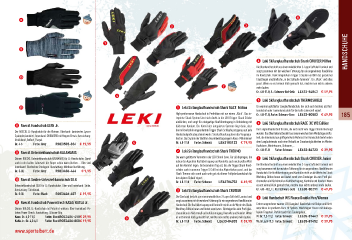 8 8 2 3 1 9 Handschuhe 4 LekiSkilanglaufhandschuhSharkCRUISERMitten Die Oberhand besteht aus einem winddichten 3-Lagen Softshell Laminat und sorgt zusammen mit der weichen Fütterung für ein angenehmes Handklima im Handschuh. Dank integriertem Trigger S System entfällt das gerade bei A Fäustlingen umständliche „in die Schlaufe fummeln“. Ein „Klick“ und alles passt. Wenn es erst einmal klick gemacht hat, möchte man nichts anderes 7 mehr laufen. + 4 Gr.6.0-11.0,F.:Schwarz-Rot-Gelb LE633-84843 € 59,95 5 LekiSkilanglaufhandschuhTHERMOSHIELD B 1 LekiSkilanglaufhandschuhSharkRACEEdition Ein warmer gefütterter Langlaufhandschuh, der sich auch bestens als Rad- handschuh oder Tourenhandschuh für die kalte Jahreszeit eignet. High-performance Handschuh in Perfektion mit nur einem „Klick“. Das in- Gr.6.0-11.0,Farbe:Schwarz-Grau LE633-80803 € 49,95 185 tegrierte Shark System lässt sich direkt in die LEKI Trigger Shark Stöcke einklicken, und sorgt für einzigartige Kraftübertragung in Verbindung mit 6 LekiSkilanglaufhandschuhRACEXCWCEdition 8 RoecklHandschuhGLENJr. höchstem Komfort. Der Vorteil des integrierten Systems liegt darin, dass Der ROECKL LL-Handschuh für die Kleinen. Oberhand: laminiertes Lycra+ die im Handschuh eingearbeitete Trigger Shark Schlaufe passgenau auf jede Der Langlaufhandschuh für alle, die noch nicht vom Trigger Shark überzeugt wurden. Das Obermaterial besteht aus einem weichen Gore Windstoppersofts- Spanndex laminiert. Innenhand: DURADERO mit Noppen Besatz. Ausstattung: Handschuhgröße abgestimmt wurde. Stockschlaufen gehören der Vergangen- hell, die Innenhand aus griffgem Nash Material. Der Handschuh bietet neben Strickbund, Refect, Paspel. heit an. Das System der Biathlon Gesamtweltcupsiegerin Kaisa Mäkäräinen! dem Langlaufeinsatz noch eine Vielzahl an Einsatzmöglichkeiten im Winter: Gr.4-6 Farbe:Grey ROE3505-834 € 19,95 5 Gr.6.0-11.0 Farbe:Schwarz LE63185123 € 79,95 Radfahren, Wintertouren, Skitouren, … 9 RoecklUnterziehhandschuhKALAMARIS 2 LekiSkilanglaufhandschuhSharkTHERMO Gr.6.0-11.0 Farbe:Schwarz LE633-84723 € 39,95 Dünner ROECKL Unterziehhandschuh KALAMARIS für LL-Handschuhe. Damit Die warm gefütterte Variante in der LEKI Shark Serie. Für all diejenigen, die 7 LekiSkilanglaufhandschuhSharkCRUISERJunior auch in der kalten Jahreszeit die Finger schön warm bleiben … Ober-und neben den Aspekten Kraftübertragung und Kontrolle auch noch großen Wert Die Oberhand besteht aus einem winddichten 3-Lagen Softshell Laminat und Innenhand: Elastisches Strickgarn. Ausstattung: Nahtlose Ausführung. auf den Komfort legen. Ein besonderer Tipp ist, das die Trigger Shark Hand- sorgt zusammen mit der weichen Fütterung für ein angenehmes Handklima im Gr.S-XL Farbe:Grey ROE3406-446 € 9,95 schuhe auch in unseren Trigger S Griff bei den Alpinstöcken passt, und der Shark Thermo sich somit auch sehr gut als dünner Frühjahrshandschuh für Handschuh. Die Kraftübertragung und Kontrolle reicht an die Werte des Shark A RoecklSeiden-UnterziehhandschuhSILK den alpinen Skilauf eignet. LE63784753 € 69,95 Worldcup Edition heran und bietet somit vom Einsteiger bis zum Prof glei- chermaßen ein Höchstmaß an Kraftübertragung, Kontrolle und Komfort. Wenn Farbe:Schwarz Gr.6.0-11.0 Unterziehhandschuh SILK für LL-Handschuhe. Ober-und Innenhand: Seide. es erst einmal klick gemacht hat, möchte man nichts anderes mehr laufen. Ausstattung: Strickbund. 3 LekiSkilanglaufhandschuhSharkCRUISER Gr.4.0–8.0,F.:Rot-Schwarz-Gelb LE638-80291 € 49,95 Gr.S-XL Farbe:Black ROE3406-457 € 19,95 Die Oberhand besteht aus einem winddichten 3-Lagen Softshell Laminat und 8 LekiHandschuhWSFleeceDoubleMen/Women B RoecklHandschuhPowerstrechKASA/KATLAJr. sorgt zusammen mit der weichen Fütterung für ein angenehmes Handklima im Extrem angenehmer warmer LEKI Langlauf-Handschuh mit Stulpe und Klett- Handschuh. Die Kraftübertragung und Kontrolle reicht an die Werte des Shark Dünner ROECKL LL-Handschuh mit Polartec Funktion. Ober-Innenhand: Po- Worldcup Edition heran und bietet somit vom Einsteiger bis zum Prof glei- verschluss in sportivem Race Fit System. Windstopper Fleece mit abklapp- lartec Power Strech. Ausstattung: Silicone-Grip. chermaßen ein Höchstmaß an Kraftübertragung, Kontrolle und Komfort. Wenn barem Fingerteil. Perfekt auch fürs Tourengehen… Kasa:Gr.6,0-11,0 Farbe:Black ROE3406-458 € 29,95 6 es erst einmal klick gemacht hat, möchte man nichts anderes mehr laufen. M:Gr.7,5-11,0 Farbe:Schwarz LE635-81443 € 39,95 KatlaJr.:Gr.4,0-6,0 Farbe:Black ROE3406-800 € 19,95 Gr.6.0-11.0 Farbe:Schwarz LE633-84833 € 59,95 W:Gr.6,0-11,0 Farbe:Schwarz LE635-81452 € 39,95 www.sportalbert.de