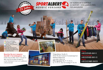 DIE NORDISCHE KOMPETENZ IM SKISPORT – VON LANGLÄUFERN FÜR LANGLÄUFER www.nordic-tuning.de Weltcup Strukturschliffe Diese Saison Neu! Erweitertes Strukturschliff angebot Klingenthaler Str. 34 auf schwedischer Tazzari von Ski WM. Mehr Infos: www.nordic-tuning.de DE 08262 Muldenhammer/ Renn service Maschine mit Neues Hochdruck Reinigungs system für den Schleif- OT Tannenbergsthal Thermo box behandlung stein – ergibt im Ski ein perfektes Strukturbild in bisher Tel. +49 (0) 37465-40410 noch nicht erreichter Qualität. Fax +49 (0) 37465-404129 Johann Olssom (50 km Gold Ski WM Fiemme 2013) mit dem schwedischen Cheftechniker und Tazzari RP23 Maschine 2 ● Sven Albert | Geschäftsführung ● Edgar Pöhland | Ski-Tuning/Versand ● Tina Beutner | Buchhaltung ● Heiko Meinel | Verkauf Hartware/Textil ● Arthur | Security ● Frank Albert | Lager ● Anke Schwabe | Auftragsbearbeitung ● Heiner Albert | Senior Chef/Nordic Tuning ● Karsten Schiepe | Service/Verkauf Hartware ● Ina Lischke | Verkauf Textil Telefon +49(0)34544-0 Besuchen Sie uns in unserem Klingenthal Schwedischer Klingenthaler Straße 34er Straße 34 Geschäft in Tannenbergsthal – hier 08262 Muldenhammer/Tannenbergsthal Serviceabteilung Waxtruck mit Tazzari fi nden Sie auf über 400 m die ganze die ganze info@sportalbert.de +49(0)34544-1 RP23 Maschine 2 Welt des Nordischen Skisports … www.sportalbert.de Telefax unser Onlinesortiment zum anfassen Öffnungszeiten Mo-Fr. 9–18 Uhr, +49(0)076 4429 unser Onlinesortiment zum anfassen und probieren! Sa. 9–13 Uhr, bei Schneelage 9–15 Uhr Erfolge der Tazzari RB23 Gold Silber Bronze Rennschliffe die bei der 50 km Herren: Johan Olssson, Schweden Team Sprint Damen: Schweden 50 km Herren: Alexsej Poltoranin, Kasachstan Skiweltmeisterschaft 2013 Team Sprint Damen: USA Team Sprint Herren: Schweden Sprint Herren: Alex Harvey, Canada Val de Fiemme gelaufen 15 km Herren: Johan Olsson wurden Staffel Herren: Schweden