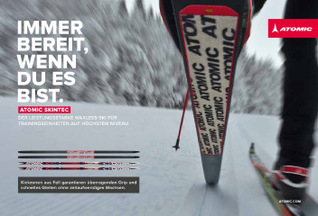 SkI JuniOr Skate + comBi IMMER BEREIT, WENN DU ES BIST. 22 ATOMIC SKINTEC DER LEISTUNGSSTARKE WAXLESS-SKI FÜR TRAININGSEINHEITEN AUF HÖCHSTEM NIVEAU. Kickzonen aus Fell garantieren überragenden Grip und schnelles Gleiten ohne zeitaufwendiges Wachsen. ATOMIC.COM Besuchen Sie unseren Onlineshop: Skintec_Key_visual_235x160.indd 1 07.10.14 15:16