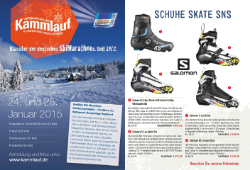 langlaufSchuhe Skate SnS Schuhe Skate SnS 1 2 3 32 4 24. und 25. 1 SalomonCarbonSkateLABLimitedEdition Worldwide800 Größter Ski Marathon Neu! Limitiertes Sondermodell! Ab Herbst 2014 lieferbar. Der Schuh aus dem Januar 2015 Naturpark Erzgebirge Vogtland Weltcup! 100% Carbon. Der CARBON SKATE ist eine neue Revolution des 3 SalomonS-LabSkate Ostdeutschlands – Tradition im Skating-Schuhs und bietet perfekte Passform, Kraftübertragung, Haltbarkeit, Custom Fit Lösung, Torsionssteifgkeit bei minimalem Gewicht. Komplettes Der Internationale Kammlauf in Klingen- CARBON CHASSIS, thermisch verformbarer Innenschuh, durch Custom Fit Unser leichtester Skating-Rennschuh mit durchgehendem Carbon Chassis für Klassische Technik (26 und 43 km) thal lockt jedes Jahr bis zu 1500 Teilneh- (SIDAS) anpassbar, Salomon Racing Passform 100 mm, Nur 860 g/Paar!!! maximale Kraftübertragung. RS17 + verstärkte Flügelkonstruktion, Carbon SA368150000 € 849,95 3D Skate Chassis, Carbon Skating-Platte, Skating-Flex, Sensift Überlap- Gr.:7,5-12 · · · · · · · · · · · · · · · · · · · · · · · · · · · · · Klingenthal. Strecken über 26 und 43 km, pungskonstruktion, S-Lab Manschette & 3D Energyzer, Schnürabdeckung mer in die Musik- und Wintersportstadt Freistil (26 km) 2 SalomonS-LabSkatePro mit diagonalem Reißverschluss, Gewicht: 1200 g/Paar. · · · · · · · · · · · · · · · · · · · · · · · · · · · · · in freier und klassischer Technik, auf Überarbeiteter High Performance Skatingschuh für Top-Racer und Trainer. Gr.:3,5-14 SA354826 € 299,95 Familienlauf (10 km) dem Kammweg mit seiner reizvollen Dieser Schuh überzeugt durch geringeres Gewicht, vielseitige Anpassungs- · · · · · · · · · · · · · · · · · · · · · · · · · · · · · Landschaft führen durch die ausgedehnte möglichkeiten und einen Carbon Frame, der für beste Kraftübertragung sorgt. 4 SalomonRSCarbonSkate Kinderlauf (5 km) Fichtenwälder. Dank der Höhenlage, die Carbon Frame, Skating-Flex, Second Skin-Konstruktion, breites Ratschen- High Performance Skatingschuh mit unvergleichlichem Komfort und bester System, S-Lab Carbon Manschette & 3D Energyzer, Getrennte Quicklace- Performance. Carbon Skating-Platte, Sensift, S-Lab Manschette & 3D Ener- konstant über 800 m ü. NN liegt, ist eine ® ® Schnürung, RS17 + verstärkte Flügelkonstruktion / SNS PILOT 3 Racing- gyzer, Custom Fit, Schnürabdeckung mit diagonalem Reißverschluss, SNS ® Anmeldung und Infos unter: Kammloipe zu einer der schneesichersten Außensohle, Gewicht: 1230 g/Paar. SA327682 € 379,95 PILOT 2 Carbon Pro-Außensohle, Gewicht: 1200 g/Paar. hohe Schneesicherheit gegeben, die die ® SA354822 € 229,95 Gr.:3,5-13 Gr:3,5-13 www.kammlauf.de in Deutschland gemacht hat. Besuchen Sie unseren Onlineshop: