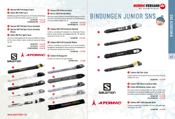 5 SalomonSNSProflEquipeClassic A SalomonSNSUniversalmanual 6 AtomicSNSProflClassic B AtomicSNSUniversalmanual Die Wettkampf-geprüfte Profl Equipe Classic ist eine leichte und zuverlässige Diese neuen, manuell einstellbaren Tourenbindungen mit Universal-Flex zeich- Bindungen JuniOr SnS Bindung, die mit allen SNS Schuhen kompatibel ist. Flex: 85. nen sich durch hohe Zuverlässigkeit und eine äußerst leichte Handhabung aus. SA354553 € 42,95 Für Frauen und Männer geeignet. Flex: 85. ATAH5006180 € 42,95 SA368185 € 39,95 ATAH5006540 € 39,95 7 SalomonSNSPilotSportClassicAutomatic Bindungen SnS 8 SalomonSNSPilotSportClassicAutomatic C SalomonSNSProflAutomaticUniversal Women Praktische Tourenbindung mit universellem Flex. Durchgehende Führungs- 1 9 AtomicSNSPilotSportClassic platte für bessere Kontrolle und Steuerbarkeit des Skis. Mit einfachem, automatischem Einstieg. Flex: 100. Diese Classic-Bindung gewährleistet die verbesserte Stabilität und Effzienz SA368187 € 39,95 des Pilot-Systems. Women: farblich auf Damenski abgestimmte Bindung. Flex: 100. D SalomonSNSProflAutomaticWomen SA354551 € 44,95 2 Women SA354552 € 44,95 Praktische Tourenbindung mit spezifschem Flex für Damenschuhgrößen. ATAH5000022 € 44,95 Durchgehende Führungsplatte für bessere Kontrolle und Steuerbarkeit des Skis. Mit einfachem, automatischem Einstieg. Flex: 95. SA368186 € 39,95 E SalomonBindungsplatte 3 43 Passend für alle Salomon Profl Equipe Bindungen. SA78847201 € 9,50 5 A 4 1 SalomonSNSPilotJunior Kontrolle und Komfort für Kids dank Pilot System, dazu einfaches Öffnen und 6 B Schließen. Flex: Junior. SA354554 € 34,95 7 2 SalomonSNSUniversalmanualJunior C 3 AtomicSNSUniversalmanualJunior Neue manuelle Universal-Bindung für Kinder und Junioren. Sie bietet solide Zuverlässigkeit, eine kinderleichte Handhabung und läßt sich auf unterschied- 8 D liche Größen einstellen. Schuhgrößen-Kompatibilität: UK 9K-7,5. Flex: Junior. SA368189 € 29,95 ATAH5006580 € 29,95 9 E 4 SalomonSNSProflAutomaticJunior Praktische Tourenbindung mit weicherem, auf Junior-Schuhgrößen abge- stimmtem Flex. Flex: Junior. SA368188 € 29,95 www.sportalbert.de