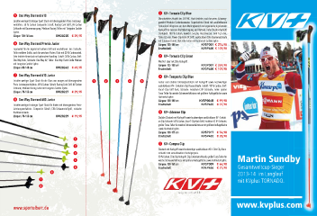 1 KV+TornadoClipBlue 5 OneWayDiamond610 Leichter wertiger Einsteiger Sport Stock mit überragendem Preis-Leistungs- Überarbeitetes Modell des CH1 WC. Noch leichter, noch besseres Schwung- gewicht! Modular Carbonbauweise. Superleichter Stock mit ausklickbarem verhältnis. 40 % Carbon Composite Schaft, Racing Cork Griff, AV Carbon Schlaufen Griffsystem aus dem Weltcupbereich mit ergonomisch geformten Schlaufe mit Daumenausgang, Medium Racing Teller mit Tungsten Carbite Korkgriff für bessere Kraftübertragung und Vortrieb. Hohe Bruchsicherheit/ Spitze. Steifgkeit. 100 % Carbon, Gewicht: 54 g/m, Durchmesser: Griff 16,5 mm, Längen130-165cm OW20225 € 39,95 Teller 8,5 mm, Power Clip Kork OR Griff, ausklickbare Elite Daumenschlaufe mit Salomon Patent, Disk Elite Teller mit Hartmetall Carbite Spitze 6 OneWayDiamondPremioJunior Längen:135-180cm KV5P001 € 274,90 Topmodell für die Jugend mit selbem Griff und verstellbarer Jun.-Schlaufe. Ersatzschaft: KV5P400 € 109,90 langlaufStöcke Teller mittlere Größe, auch für weichere Pisten. Rohr mit 30 % Carbonanteil. Sehr leichter Rennstock mit optimalem Handling. Schaft: 30 % Carbon, Griff: 2 KV+TornadoClipGreen One Way Kork, Schlaufe: One Way AV, Teller: One Way Flash Größe Medium Wie Nr.1 aber mit Elite Korkgriff. mit Tungsten Carbite Spitze. Längen:135-180cm KV3P001 € 269,90 Längen:80-140cm OW20242 € 49,95 Ersatzschaft: KV3P400 € 109,90 7 OneWayDiamond610Junior 3 KV+TempestaClipBlue Leichter wertiger Sport Stock für die Stars von morgen mit überragendem 1 2 3 4 5 Fester und stabiler Skilanglaufstock mit Korkgriff sowie hochwertiger Preis-Leistungsverhältnis. 40 % Carbon-Schaft, Racing Cork Griff, AV Carbon ausklickbarer KV+ Evolution Clip Raceschlaufe. Schaft: 90 % Carbon, Griff: Schlaufe, Medium Racing Teller mit Tungsten Carbite Spitze. Race2-Clip-Griff Kork, Schlaufe: Evolution-CLIP-Schlaufe, Teller: großer Längen:70-135cm OW20227 € 29,95 Forza Teller für weiche Schneeverhältnisse mit größerer Aufagefäche sowie Hartmetallspitze. 8 OneWayDiamond600Junior Längen:130-180cm KV5P006B € 99,90 Leichter wertiger Einsteiger Sport Stock für Kinder mit überragendem Preis- Ersatzschaft KV5P405 € 37,90 49 Leistungsverhältnis. Composite Schaft, EVA-Schaumstoffgriff, einfache Biathlonschlaufe. 4 KV+AdvanceClip Längen:70-135cm OW20229 € 19,95 Stabiler Skistock mit Korkgriff sowie hochwertiger ausklickbarer KV+ Evoluti- on Clip Schlaufe. 50 % Carbon, Race2-Clip Kork Griff, Evolution-CLIP-Schlaufe, großer Forza Teller für weiche Schneeverhältnisse mit größerer Aufagefäche sowie Hartmetallspitze. Längen:130-175cm KV5P017 € 74,90 Ersatzschaft KV5P403 € 28,90 1 5 KV+CampraClip 2 Skistock mit Korkgriff sowie hochwertiger ausklickbarer KV+ Elite Clip Race- 3 schlaufe zum sensationellen Einsteigerpreis. Martin Sundby Martin Sundby 30 % Carbon, Elite Clip Korkgriff, Clip Evolutionschlaufe, großer Forza Teller für Martin Sundby 4 weiche Schneeverhältnisse mit größerer Aufagefäche sowie Hartmetallspitze. Längen:130-165cm KV3P009 € 64,90 5 Ersatzschaft KV4P406 € 21,90 Gesamtweltcup-Sieger 6 2013-14 im Langlauf 7 mit KVplus TORNADO. 8 www.kvplus.com www.kvplus.com www.kvplus.com www.sportalbert.de