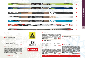 8 Back country 9 A B C D 57 E A FischerOutback68 Im Outback gibt es keine Wege und Grenzen. Dieses stabile Stahlkantenmodell bringt den Läufer sicher durch wechselndes Gelände weitab von jeder Spur. Durchgehende Stahlkante, Offtrack Crown Steigsystem, Speed Grinding, D SalomonXADVFreeGrip 8 FischerE99EasySkinXtralite Nordic Rocker Camber, Seitenform: 68-59-64 mm, Gewicht: 1990 g/179 cm. Der stabile, zuverlässige und für jedes Terrain gewappnete X-Adventure Free Extrem robustes und leichtes Wachs-Modell, ausgerüstet mit dem neuen Easy Längen:169,179,189cm FIN55513 € 229,95 ist mit 1-0-1 Stahlkanten und G2 Plus Steighilfe-Technologie ausgestattet. Er Skin Steigfell-Befestigungssystem für einfaches und schnelles Anbringen bzw. B FischerSpider62NIS vermittelt dir das notwendige Vertrauen, um auf Abenteuertour zu gehen. Heel Entfernen. Stahlkante komplett durchgehend, Easy Skin Steigfell, Seitenform: Toe Spannung, D2FC - Digital Dynamic Flex Control, G2 Plus, 1-0-1 Stahlkante, 66-54-61 mm, Ultra Finish, Sintec Belag, Air Tec, Nordic Rocker Chamber, Stahlkantenski für grenzenloses Outdoor-Vergnügen – ein sicherer und G2-Belag, Light Cut 59-50-55 mm, Gewicht: 1770 g. Gewicht: 1950 g/200 cm, incl. 1 Paar Fischer Easy Skin Steigfell (FIK50014). zuverlässiger Begleiter durch jedes Gelände! Offtrack Crown Steigsystem, Längen:168,180,192,202cm SA355353 € 179,95 Längen:180,185,190,195,200,205,210cm Air Tec, Speed Grinding, Nordic Rocker Camber, Seitenform: 62-52-60 mm, FIN53014 € 299,95 Gewicht: 1790 g/179 cm. E MadshusBC55MGV+ Längen:169,179,189cm FIN54613 € 179,95 9 FischerE99CrownXtralite No-Wax-Ski fügt unseren klassischen Backcountry-Tourenski das progressive Multigrip Vario+ System hinzu und bietet damit leichte, robuste Allround- Extreme Robustheit und Leichtigkeit machen den E99 Xtralite mit Stahlkante C FischerAdventure56NIS Performance, die sich besonders beim Langlaufen abseits der Loipe und zur unbestrittenen Nummer Eins bei Polarexpeditionen. Stahlkante komplett Für Läufer, die sich fallweise auch in der Loipe aufhalten: Mit Nordic Rocker im Tiefschnee auszahlt. Dank der breiteren Schaufelform können Sie leicht durchgehend, Offtrack Crown Steigsystem, Ultra Finish, Sintec Belag, Air Tec, Konstruktion für einfaches Gehen im verschneiten Gelände. Durchgehende Ihre eigene Spur im frischen Schnee legen. Und wegen der durchgehenden Nordic Rocker Chamber, Seitenform: 66-54-61 mm, Gewicht: 1950 g/200 cm. Stahlkante, Offtrack Crown Steigsystem, Speed Grinding, Nordic Rocker Stahlkanten laufen Sie auch dann noch sorglos, wenn der Schnee härter wird. Längen:180,185,190,195,200,205,210cm Camber, Seitenform: 56-48-54 mm, Gewicht: 1690 g/179 cm. Längen:170,180,190,195,200,205cm FIN53114 € 239,95 Längen:169,179,189cm FIN54113 € 149,95 MA1810000 € 199,95 www.sportalbert.de Kaufe Ski im Set-Konfgurator mit Schuhen/Bindung/Stöcken zum Vorteilspreis: www.sportalbert.de