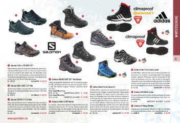 A 4 6 WinterSchuhe 7 B 9 5 61 D 8 5 SalomonXUltraLTRGORE-TEX ® Dieser erstklassige, technische Hikingschuh kombiniert einen robusten Leder- B AdidasSchuhTerrexConraxJunior schaft mit dem Klima Komfort von Gore Tex. Damit ist er jederzeit startbereit für den trail und besticht durch globalen Style. Das Obermaterial ist aus Der ADIDAS Winter- Laufschuh Terrex Conrax ist leicht und wasserdicht, das Nubukleder mit einer Zehenschutzkappe aus Gummi und verfügt über einen C Obermaterial ist aus kräftigem, strapazierfähigen Nylon-Polyestergewebe Fersenriemen und Fersenpolsterung aus Schaumstoff, Schnüsenkeltasche und kombiniert. Aufgesetzte TPU-Elemente sorgen für Seitenstabilität im Fuß- ® vernähter Zunge. Farbe: Absolute Brown-X/Black/Navajo. 8 SalomonMAFADIGORE-TEX Men/Women bereich, die Gummikappe an der Ferse schützt und dient als Halterung für Gr.:7,5-12,5 SA366996 € 149,95 Schneeschuhe. Innen ist der Stiefel komfortabel gepolstert und mit feinem Leichter und wasserdichter Wanderstiefel, auch als Schneeschuh geeignet. Microfeece gefüttert und hält die Füße auch bei eisigen Temperaturen rundum ® ® 6 SalomonNytroGORE-TEX Men Mit GORE-TEX Membran, weichem Fleecefutter und Contagrip Proflsoh- A AdidasSchuhTerrexConraxCH warm. Das wintertaugliche Profl sorgt für Trittsicherheit auf Eis und Schnee. ® le. GORE-TEX Membran, Contagrip Proflsohle , wasserdicht, weiches ® ® High Performance Kaltwetter-Schuh mit GORE-TEX und neuem, aggressivem Fleecefutter. Gr.:3,5-7,0 ADIG62601 € 109,95 ® Sohlendesign für hervorragende Griffgkeit auf Eis und Schnee. Farbe: Black/ Farbe:Asphalt/Black/Thyme Der ADIDAS Winter- Laufschuh Terrex Conrax ist leicht und wasserdicht, das Obermaterial ist aus kräftigem, strapazierfähigen Nylon-Polyestergewebe C SalomonOTAWinterJunior Black/Autobahn. M:Gr.:7,5-12,5 SA359736alt:€139,95 € 119,95 kombiniert. Aufgesetzte TPU-Elemente sorgen für Seitenstabilität im Fuß- Gr.:7,5-12,5 SA108616 € 169,95 Farbe:Asphalt/Black/Cane bereich, die Gummikappe an der Ferse schützt und dient als Halterung für Die coolsten Winterstiefel für Kinder, die Wasserdichtigkeit und Komfort W:Gr.:4,0-8,0 SA359737 alt:€139,95 € 119,95 durch die Kombination von Hochleistungstechnologien bietet. Farbe: Gen- 7 SalomonSWITCH2TSCSMen Schneeschuhe. Unter der strapazierfähigen Zehenschutzkappe befndet sich tiane/Black/Green. ein verdeckt angebrachter D-Ring, der als Halterung für Gamaschen fun- Warmer, hoch geschnittener Stiefel im Snowboard-Stil. Dank seiner Natural 9 SalomonKAINACSWPWomen giert. Der einfach bedienbare Schnellschnürzug versteckt sich unter einer Gr.:31-38 SA371979 alt:€89,95 € 69,95 Motion Sohle kannst du deinem Bewegungsdrang auch nach dem Schließen Der stylische, isolierte Kaina kombiniert Climashield Wetterschutz und Lasche aus wasserabweisendem Softshell. Innen ist der Stiefel komfortabel der Skilifte freien Lauf lassen und durch tiefen Schnee ziehen. Das Oberma- Isolierung für Temperaturen bis -18°C mit einer schlanken Damenpassform gepolstert und mit feinem Microfeece gefüttert und hält die Füße auch bei D SalomonXTWingsWPKids terial ist ein wasserdichtes, geöltes Nubukleder. Farbe: Dark Sand/Black/ und femininem Design. Der ideale Begleiter für kalte Tage in der City und eisigen Temperaturen rundum warm. Das wintertaugliche Profl sorgt für Leistungsstarker und wasserfester Laufschuh für Kinder. Viel Technologie Aluminium. Spaziergänge im Wintersportort. Farbe: Black/Asphalt/Flashya-X. Trittsicherheit auf Eis und Schnee. in einem weicher abgestimmten Design. Farbe: Asphalt/Autobahn/Black. Gr.:7,5-12,5 SA366433 € 169,95 Gr.:4,5-7,5 SA366803 € 119,95 Gr.:7,0-12,0 ADIM22757 € 179,95 Gr.:30-UK5,5 SA108396 € 74,95 www.sportalbert.de