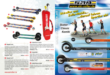 C Skiroller aus ...darauf fahren WWW.SKI-ROLLER.DE WWW.SKI-ROLLER.DE WWW.SKI-ROLLER.DE Sportler ab! Sportler ab! Sportler ab! D Zella-Mehlis... rollSki & BlAding Skater G Classic E Kombi F 71 E SkiskettFirePEJunior C SkiskettFirePL Kindertrainingsrollski für Skatetechnik. Die Version Fire PE hat Polyure- Die Version PL ist für das Skaten ausgelegt, besitzt aber Räder aus einem thanräder mit Kunststofffelge. Rahmen: Alu 6082 T6, Achsabstand: 600 mm, Radmaterial: Polyurethan und Felge aus Kunststoff, Raddurchmesser und langsameren Polyurethanmaterial, geeignet zum intensiveren Trainieren oder -breite: Ø 80 x 30 mm. für Gelände, auf denen man ansonsten zu schnell würde. Der Polyurethantyp Gewicht/Paar:1100g SK016 € 160,00 weist eine sehr gute Charakteristik bzgl. des Straßengriffs und der Abnutzung auf. Rahmen: Alu 6082 T6, Achsabstand: 600 mm, Radmaterial: Mischung von F SkiskettIBEX langsamem Polyurethan und Gummi, Felge aus Aluminium, Raddurchmesser und -breite: Ø 80 x 30 mm. Skiskett IBEX, der luftbereifte Rollski der das Laufen auf Waldwegen er- Gewicht/Paar:1400g SK006 € 168,00 möglicht. Ideal auch für raue oder schlechte Asphaltstraßen. Hochwertige supplier of waxing equipment of The sweden Biathlon team Alukonstruktion bei geringstem Gewicht. Rahmen: Alu 6082 T6 mit Edelstahl D SkiskettFirePV Gabeln, Achsabstand: 640 mm, Radmaterial: Luftbereifung, Raddurchmesser Der Fire PV besticht durch seine Polyurethanräder mit elastischem und und -breite: 150 x 30 mm. SK100 € 250,00 Gewicht/Paar:2200g geschwindigkeitstauglichem Material, was eine hohe Beständigkeit beim Skating und wenig Abrieb aufweist. Die Version PV hat sehr schnelle und elastische Polyurethanräder mit Aluminiumfelge, die besonders für schnelle G SkiskettRollskiTasche Läufe und Bergläufe geeignet sind. Rahmen: Alu 6082 T6, Achsabstand: 600 Geräumige und praktische Tasche aus widerstandsfähigem Nylon, mit mm, Radmaterial: Polyurethan und Felge aus Aluminium, Raddurchmesser Schultergurt und zwei Seitentaschen für diverses Zubehör. Für bis zu 2 Paar und -breite: Ø 80 x 30 mm. Rollski geeignet. Gewicht/Paar:1300g SK026 € 200,00 SK0018 € 35,00 www.sportalbert.de