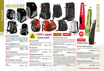 ruckSäcke 5 8 A 1 2 acceSsOireS 2 gewehrtaschen 1 7 9 6 3 4 92 B 1 FischerBackpackNotebook Großer Rucksack mit gepolstertem Fach für Notebook. Große Fächerkonstruk- 9 MadshusNanosonicRucksack tion, Deluxe Organisationsfächer, Schultergurte mit Federungssystem, gepols- Der Nanosonic Rucksack ist für den Einsatz in Training und Rennen geeignet. tertes Rückenpanel, MP3 Playertasche, Accessoirefach mit Reißverschluss. 5 KV+Rucksack50 Die anatomische Form sorgt für optimalen Komfort und Performance. Er Volumen:29l FIZ00513 € 59,95 verfügt über Hüft- und Schultergurte sowie eine separate Tasche für eine Großer, bequemer Tagesrucksack für Wanderungen oder Skitouren. Kompres- 3 2 FischerBackpackRace55/40 sionsgurte, Schutzhülle, Gewicht: 1,5 kg. Trinkblase. 600D Polyester Ripstop PU. MA1834505 € 49,95 Maße:24x12,5x48cm,Vol.:8,8l Separates Fach für Skischuhe mit Zugriff von außen, Trinkfaschenhalterung, Maße:35x60x22cm,Volumen:50l KV5D24 € 79,90 1 MadshusBiathlonGewehrtasche verstellbarer Hüftgurt, herausnehmbares Fach für Helm und Zusatzausrüstung. A ONEWAYTeamWCRucksack Volumen:55l FIZ03513 € 64,95 6 LekiRucksack Der PRO TEAM Ruchsack ist mit seinem wasserfesten und abriebfesten Gepolsterte Waffentasche. Material: 600 D Polyester Ripstop, Gr.: 115 x 12 Volumen:40l FIZ01313 € 59,95 Der ideale Begleiter für unterwegs. Hauptfach mit Reißverschluss. Aufgesetzte Material hervorragend für Outdoor-Trips geeignet. Auch ideal für die Renn- x 26,5 cm. Vordertasche mit Reißverschluss. MA1844504 € 39,95 3 FischerBackpackNeo30 Maße:45x35x17cm LE358200006 € 69,95 ausrüstung während der Saison. OW90080 € 79,95 Volumen:50l Hochwertiger Rucksack für Skilanglauftouren sowie Skitouring. Ergonomisch 7 MadshusRaceDayRucksack 2 ONEWAYBiathlonGewehrtasche geformte Schultergurte, Air-Mesh Rückenpolsterung, verstellbarer Hüftgurt, B SwixRaceXRucksack Biathlon Gewehrtasche nach IBU-Norm mit Fenster. Mit kleiner Tasche in der höhenverstellbarer Brustgurt. Mittelgroßer Rucksack mit ausreichend und wohl sortiertem Stauraum für Ultraleichter Race-Rucksack. Refektor aus Energlo (-Material) für höchste z.B. die Munition etc. befördert werden kann. Material: 100 % Polyestergewe- Volumen:30l FIZ01612 € 59,95 Wettkampf-Utensilien. 600D Ripstop. Sichtbarkeit. Hauptfach mit gepolsterter Hülle für Isolation und Schutz. Mit be, innen PU beschichtet, wasserdicht, Gr.: 114 x 16 x 25 cm. Maße:31,5x21x55cm,Vol.:33l MA1844502 € 99,95 OW90099 € 99,95 4 FischerBackpackCorduraFoldable Schlauchfach. Gepolsterter und belüfteter Schultergurt mit verstellbaren Trägern. Höhenverstellbar, mit Snack- und Handytasche. Brustgurt mit Kleiner, leichter und faltbarer Rucksack für Tagestouren. Faltbar, überaus 8 MadshusRucksack verstellbarem Schnellverschluss. Neopren-Hüftgurt mit zwei elastischen Fä- 3 RossignolBiathlonGewehrtasche leicht mit nur 150 g, wasserdichter Reißverschluss, wasserabweisendes Geräumiger Rucksack für Langlauf-Ausrüstung mit separaten Seitenfächern chern. Mesh-bezogenes, vorgeformtes Rückenteil zur Stütze und Ventilation. Transporttasche für Biathlon Gewehre. Material: Polyester 600D, Beschich- Material. speziell für Langlaufschuhe. 600D Polyester Ripstop Verstellbares Packvolumen. Verdeckte Regenhülle. tung: PVC. Volumen:20l FIZ03613 € 59,95 Maße:36x38,5x43cm,Vol.:48l MA1834506 € 59,95 Volumen:10l SWNNT15 € 79,95 RORK2B200 € 49,95 Besuchen Sie unseren Onlineshop: