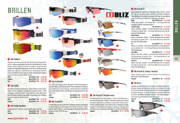 Brillen 7 BlizPursuitXT Leichte funktionelle Sportbrille für Skilanglauf, Biking, Running. verstell- bare Bügel mit gummierten Enden, einstellbare Nasenfügel, anklippbares 2 6 Softschweißband im Stirnbereich für optimale Belüftung und beschlagfreies Laufen, Elastik Strap für perfekten Sitz, abnehmbare Brillenbügel. Weiß BLIZ9054-00 € 69,95 Rahmen: weiß, Scheiben: 1 Satz Bernstein Gelb + 1 Satz Orange Multicoated, kontrastverstärkende Schlechtwettergläser 1 TeamFinnland BLIZ9054-02 € 79,95 Brillen Rahmen: weiß/blau, Scheiben: 1 Satz Blue Multicoated Glas mit Spezialbe- schichtung für optimale Sicht + 1 Satz Orange Multicoated, kontrastverstär- kende Schlechtwettergläser MattSchwarz BLIZ9054-13 € 79,95 Rahmen: matt schwarz, Scheiben: 1 Satz Blue Multicoated Glas mit Spezial- 3 beschichtung für optimale Sicht + 1 Satz Orange Multicoated, kontrastver- stärkende Schlechtwettergläser Rot BLIZ9054-41 € 79,95 7 Rahmen: rot, Scheiben: 1 Satz Silber Multicoated Glas mit Spezialbeschich- tung für optimale Sicht + 1 Satz Orange Multicoated, kontrastverstärkende Schlechtwettergläser MattSilber BLIZ9054-51 € 79,95 Rahmen: matt silber, Scheiben: 1 Satz Dark Smoke Multicoated Glas mit Spezialbeschichtung für optimale Sicht + 1 Satz Orange Multicoated, kon- 1 BlizProfipXT trastverstärkende Schlechtwettergläser BLIZ9054-84 € 79,95 95 MattGrau Aktualisierte Version der bekannten Profip, die bereits viele Erfolgsgeschich- 4 Rahmen: matt grau, Scheiben: 1 Satz Red Multicoated Glas mit Spezialbe- ten hat. Es wurde ausgiebig getestet bei Sportler und Eliteläufern im Lauf und schichtung für optimale Sicht + 1 Satz Orange Multicoated, kontrastverstär- Biathlon. New Bliz Design und verbesserte Funktionen, darunter die neuen kende Schlechtwettergläser Scharnier mit höherem Befestigungspunkt, die das Glas in eine höhere Position gehen lassen. Sphärische, unzerbrechliche Linse in Polycarbonat, 100 % UV- 8 BlizPursuitXTSchwarzPolarized Schutz, Clear Wechselscheibe, klappbare Scheibe, Nasenaufage aus weichem 5 Gummi, verstellbares Band mit Silikon (30 mm). Rahmen: Schwarz, Scheiben: 1 Satz Braun Polarized, 1 Satz Orange kontrast- Weiß BLIZ9022-02 € 99,95 verstärkende Schlechtwettergläser. Schwarz BLIZ9022-13 € 99,95 Schwarz BLIZ9054-10 € 89,95 Grün BLIZ9022-74 € 99,95 4 BlizProfipKids 9 BlizReact 2 BlizProfip Extra schmale Ausführung für Kinder. Anklappbare Scheibe mit Drehgelenk für 8 Sportbrille, für den harten Einsatz in sehr starker Sonneneinstrahlung. Unzer- optimale Belüftung und Beschlagsfreiheit. Breites verstellbares Elastikband Anklappbare Scheibe mit Drehgelenk für optimale Belüftung und Beschlags- für perfekte Passform. Leicht verspiegelte, mehrfachbeschichtete Smoke Muli brechliche Scheiben aus Polycarbonat mit Filter in der Kategorie 4, die mehr freiheit. Breites verstellbares Elastikband für perfekte Passform. Leicht Blue Scheibe(weiße Brille) bzw. Red MultiIayer Scheibe(schwarze Brille). 100 als 92 % des sichtbaren Lichts herausfltert (nicht zum Autofahren geeignet). verspiegelte, mehrfachbeschichtete Smoke Multi Blue Scheibe (weiße Brille) % UV Schutz. Verstellbare Nasenpads aus Gummi mit Drahtkern, einstellbare Bügelenden bzw. Red MultIayer Scheibe(schwarze Brille). Ersatzscheibe in Clear Multilayer Weiß BLIZ9069-02 € 59,95 6 BlizPursuitXTPhotochromatic aus Gummi, verstellbares Brillenband. Scheiben: 1 Satz Silber verspiegelt, 1 für starken Schneefall. 100 % UV Schutz. Schwarz BLIZ9069-13 € 59,95 Hochfunktionelle Brille mit überragenden- sich den Lichtverhältnissen an- Satz Orange kontrastverstärkende Schlechtwettergläser. Weiß BLIZ9059-02 € 99,95 Schwarz BLIZ9066-11 € 89,95 Schwarz BLIZ9059-13 € 99,95 5 BlizProfipOTG passenden Photochromatic Scheiben. Pinkfarbene Photochromatic Scheiben, Silber BLIZ9066-51 € 89,95 automatisch abdunkelnd und aufhellend, unzerbrechlich entsprechend EU- 3 BlizProfipSmallface Für Brillenträger über die normale Brille. Anklappbare Scheibe mit Drehgelenk Richtlinie, verstellbare Bügel mit gummierten Enden, einstellbare Nasenfügel, anklippbares Softschweißband im Stirnbereich für optimale Belüftung und be- für optimale Belüftung und Beschlagsfreiheit. Breites verstellbares Elastik- Ausstattung wie Nr. 2 aber für schmale Gesichter sowie für Frauen. band für perfekte Passform. Leicht verspiegelte, mehrfachbeschichtete Red schlagfreies Laufen, Elastik Strap für perfekten Sitz, abnehmbare Brillenbügel. Weiß BLIZ9064-02 € 99,95 MultiIayer Scheibe. 100 % UV Schutz. Schwarz BLIZ9054-19 € 129,95 9 Schwarz BLIZ9064-13 € 99,95 Schwarz BLIZ9071-13 € 99,95 www.sportalbert.de