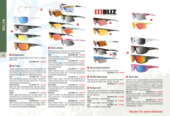 A Brillen C D G B E C BlizPaceWomen Kleinere Ausführung der beliebten Pursuit XT. Ideal für Frauen, Jugendliche oder Aktive die einfach eine formschöne, kleinere Brille bevorzugen. H 96 A BlizOptikAdapter Weiß BLIZ9056-00 € 69,95 F Optischer Adapter passend für alle Bliz Pursuit XT Brillen, zum Einpassen Rahmen: weiß, Scheiben: 1 Satz Bernstein Gelb + 1 Satz Orange Multicoated, kontrastverstärkende Schlechtwettergläser optischer Gläser. TeamFinnland BLIZ9056-02 € 79,95 BLIZ9054-RX € 24,95 Rahmen: weiß/blau, Scheiben: 1 Satz Blue Multicoated Glas mit Spezialbe- B BlizTracker schichtung für optimale Sicht + 1 Satz Orange Multicoated, kontrastverstär- kende Schlechtwettergläser Einzigartige Kombination von innovativem Design und hoher Flexibilität. Dual Schwarz/Lime BLIZ9056-11 € 79,95 D BlizPaceWomenBlackPhoto Rahmenkonstruktion zum Austauschen der unteren Rahmenhälfte oder nur mit Rahmen: schwarz/lime, Scheiben: 1 Satz Dark Smoke Multicoated Glas mit Rahmen: schwarz, Scheiben: 1 Satz Photochromatic Rose Gläser oberem Rahmen zu tragen. Verstellbarer Nasenpad aus Gummi, incl. 20 mm Spezialbeschichtung für optimale Sicht + 1 Satz Orange Multicoated, kont- BLIZ9056-19 € 129,95 Brillenband, 1 Satz Wechselglässer und 1 Wechselrahmenunterteil. rastverstärkende Schlechtwettergläser Weiß BLIZ9020-03 € 89,95 Schwarz BLIZ9056-18 € 69,95 E BlizBrilleMotionSchwarz G BlizVeloMatt Rahmen: weiß, Wechselrahmenunterteil: blau, Scheiben: 1 Satz blaue Mul- Rahmen: schwarz, Scheiben: 1 Satz Smoke-Silber Multicoated Glas mit Polycarbonate Scheiben, unzerbrechlich entsprechend EU-Richtlinie, 100 % UV Die Bilz Velo ist eine hervorragende Kombination von Stil, Komfort und Flexi- ticoated Glas mit Spezialbeschichtung für optimale Sicht + 1 Satz Orange Spezialbeschichtung für optimale Sicht + 1 Satz Orange Multicoated, kon- Schutz, Cleaning Tuch. Rahmen: schwarz, Scheiben: 1 Satz orange. bilität. Sie ist bestens geeignet für Radfahren und andere Outdoor-Aktivitäten. kontrastverstärkende Schlechtwettergläser. trastverstärkende Schlechtwettergläser BLIZ9060-18 € 39,95 4 Accessoires inklusive: Etui, Reinigungstuch und 2 weitere Gläser. 100% SchwarzPolarized BLIZ9020-10 € 99,95 MattTurquoise BLIZ9056-34 € 79,95 UV-Schutz, verstellbare Nasenpads aus Gummi mit Drahtkern, einstellbare Rahmen: matt schwarz, Wechselrahmenunterteil: matt purple, Scheiben: 1 Rahmen: matt turquoise, Scheiben: 1 Satz Red Multicoated Glas mit Spezialbe- Satz Silber Polarized + 1 Satz Orange kontrastverstärkende Schlechtwet- schichtung für optimale Sicht + 1 Satz Pink Multicoated, kontrastverstärkende F BlizSpeedJunior Bügelenden aus Gummi, inklusive Hartschalenkoffer mit Taschen für zusätz- liche Scheiben enthalten, inklusive Reinigungstuch. tergläser. Schlechtwettergläser Schmale, leichte, funktionelle Sportbrille für Skilanglauf, Biking, Running. MattLime BLIZ9063-74 € 89,95 Schwarz BLIZ9020-19 € 89,95 RotCarbon BLIZ9056-44 € 89,95 Polycarbonate Scheiben, unzerbrechlich entsprechend EU-Richtlinie, 100 % Rahmen: Matt Lime, Scheiben: 1 Satz Red Multicoated Glas mit Spezialbe- Rahmen: schwarz, Wechselrahmenunterteil: matt orange, Scheiben: 1 Satz Rahmen: rot, Scheiben: 1 Satz Red Multicoated Glas mit Spezialbeschich- UV Schutz, Cleaning Tuch. schichtung für optimale Sicht, 1 Satz Orange kontrastverstärkende Schlecht- Gold Multicoated Glas mit Spezialbeschichtung für optimale Sicht + 1 Satz tung für optimale Sicht + 1 Satz Orange Multicoated, kontrastverstärkende Weiß BLIZ9061-00 € 39,95 Orange kontrastverstärkende Schlechtwettergläser. Schlechtwettergläser Rahmen: weiß, Scheiben: 1 Satz Bernstein gelb wettergläser, 1 Satz Clear. BLIZ9063-42 € 89,95 Rot/Silber Rot/Schwarz BLIZ9020-44 € 99,95 Weiß/Pink BLIZ9056-45 € 79,95 Schwarz BLIZ9061-14 € 39,95 Rahmen: rot/silber, Scheiben: 1 Satz Dark Smoke Multicoated Glas mit Rahmen: rot/schwarz, Wechselrahmenunterteil: matt schwarz, Scheiben: 1 Rahmen: weiß/pink, Scheiben: 1 Satz Dark Smoke Multicoated Glas mit Rahmen: schwarz, Scheiben: 1 Satz silber verspiegelt Spezialbeschichtung für optimale Sicht, 1 Satz Orange kontrastverstärkende Satz Rot Multicoated Glas mit Spezialbeschichtung für optimale Sicht + 1 Spezialbeschichtung für optimale Sicht + 1 Satz Pink Multicoated, kontrast- Blau BLIZ9061-30 € 39,95 Schlechtwettergläser, 1 Satz Clear. Satz Orange kontrastverstärkende Schlechtwettergläser. verstärkende Schlechtwettergläser Rahmen: blau, Scheiben: 1 Satz silber verspiegelt Besuchen Sie unseren Onlineshop: